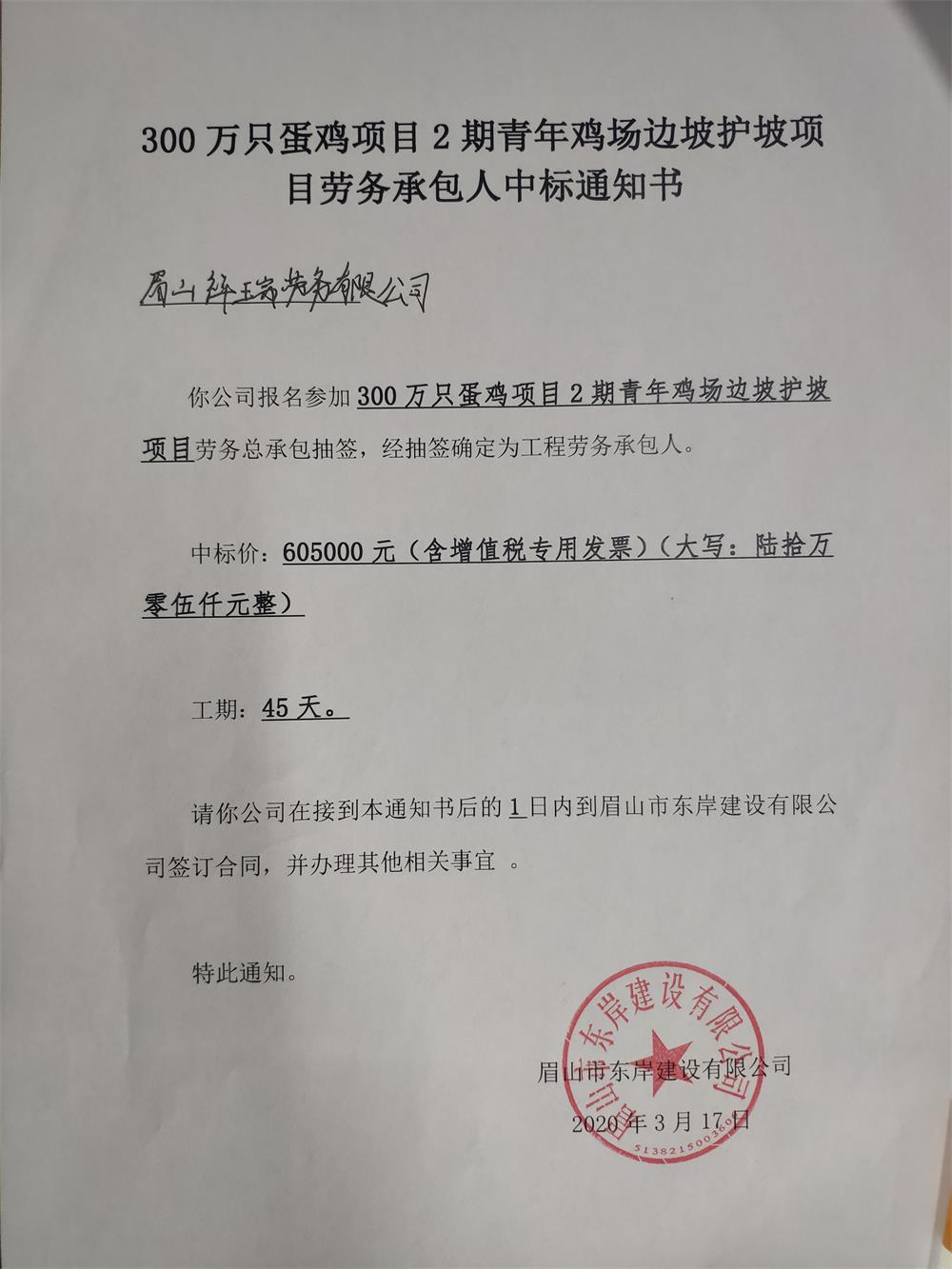 300萬只蛋雞項目2期青年雞場邊坡護坡項目中標通知