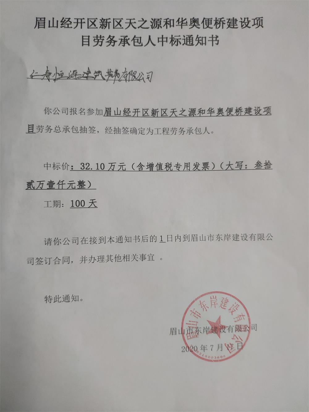 眉山經(jīng)開區(qū)新區(qū)天之源和華奧便橋建設(shè)項目中標通知